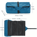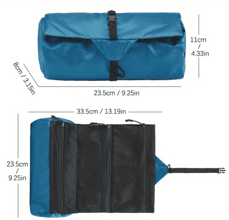 Cette trousse ingénieuse se déplie facilement et peut être accrochée à un arbre, un crochet ou tout autre support grâce à sa boucle intégrée.